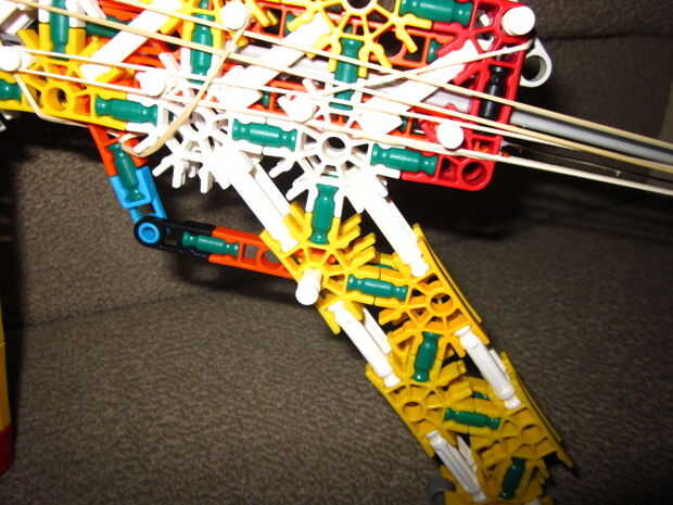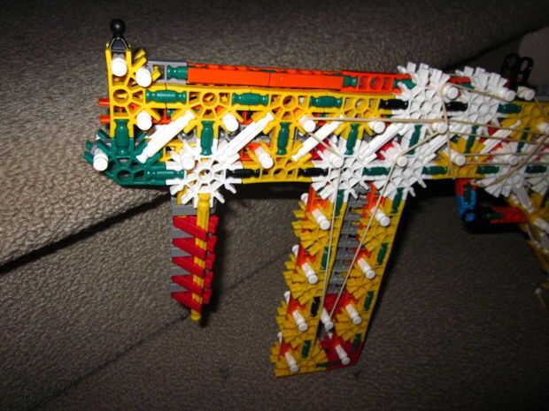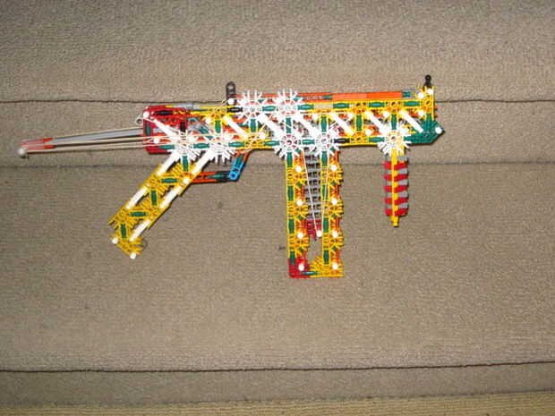 Hola chicos, estoy con otra arma de K'nex y este es phenomal. Este es un estallido de cuatro tiros. Es un tamaño de un Mp5k y tiene el rango de un rifle de asalto con un spread de una escopeta. Una de las mejores cosas acerca de esto es que tiene un práctico unjamming rod en el cañón superior. Ahora veamos los pros y contras acerca de él.