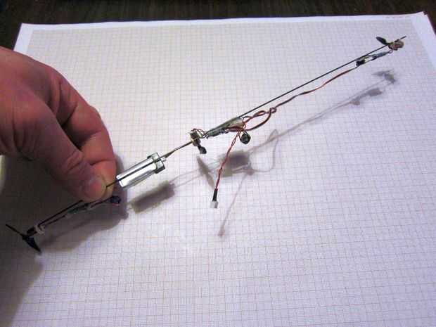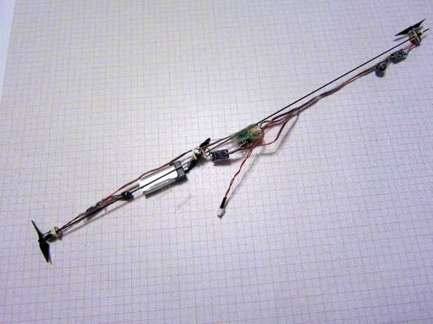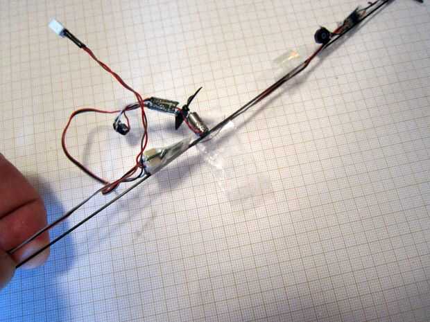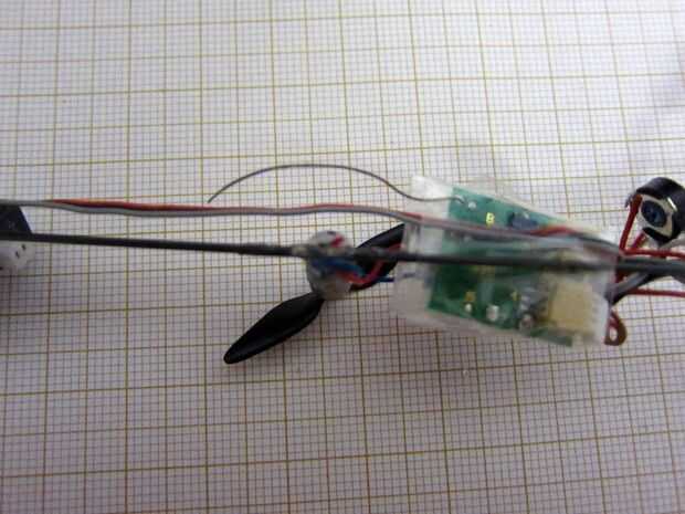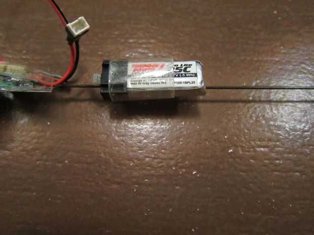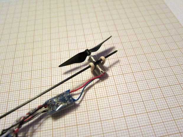 Los servos se unen con poco elásticos. Un frente se dirige hacia adelante (propulsión principal), en la trasera se une transversalmente (rotor de cola). Compruebe que los conectores alcanzarían el receptor. Si utiliza un transmisor sin servo inversa (como el mostrado), compruebe que el rotor de cola está soplando la manera correcta cuando se mueve el palillo. Si no, montar al revés. Poner en los propulsores ayuda a verificar la alineación correcta.