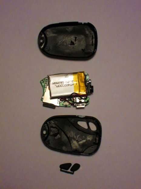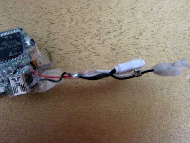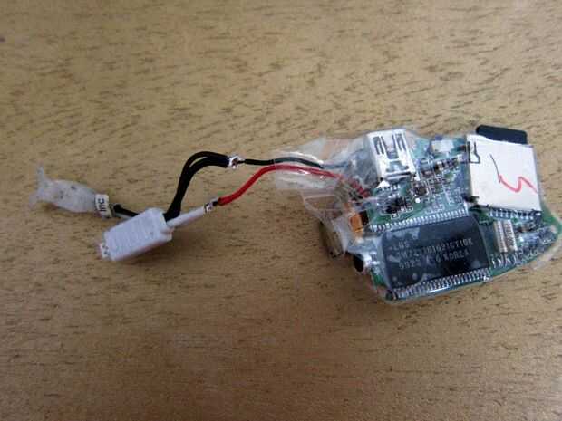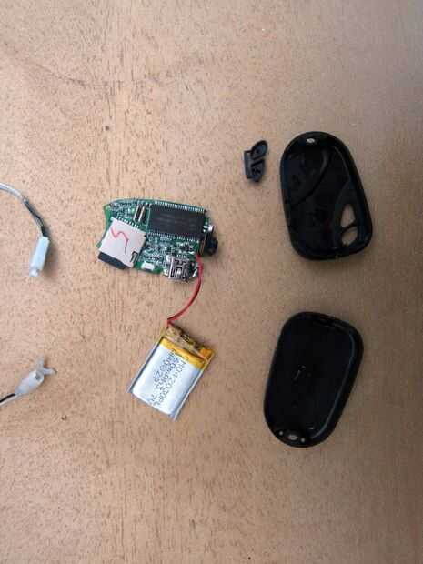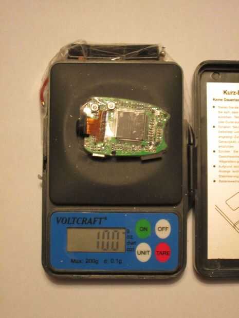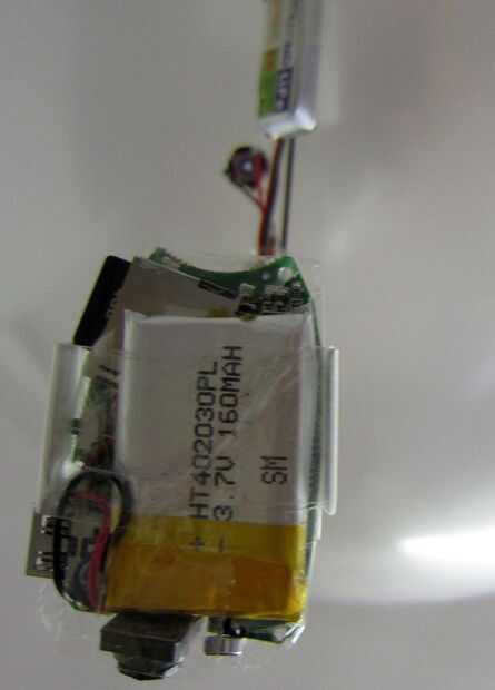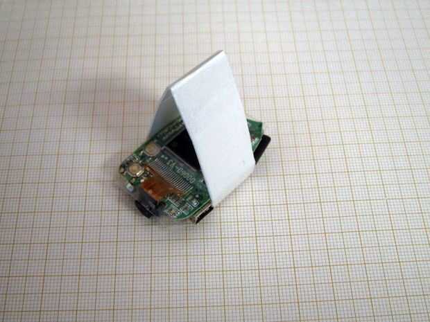 Desnudaron la cámara de su disfraz como un llavero, así que pesa unos 10g. La cubrí con alguna cinta para evitar corto circuitos de la placa de circuito impreso, pero manteniendo libre la ranura de tarjeta Micro SD y el mini puerto USB. La cinta también mantiene la cámara real en su lugar, se une a la placa de circuito impreso con una conexión flexible.