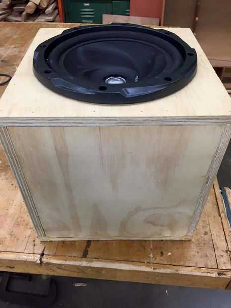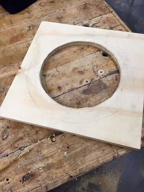 Una vez que ha marcado todas sus piezas ahora quieren cortar hacia fuera. Al llegar a la parte con cortar el agujero para el sub esta puede ser la parte más difícil así que Tómese su tiempo. Empecé haciendo una x de esquina a esquina y luego un asimiento dentro de la perforación. Luego use una sierra de calar para hacer un círculo áspero. Una vez estaba hecho con que usa una lijadora que se muestra en la imagen. Ahora su sumiso debe caber dentro. Después puede usar la pistola de clavos y el pegamento para madera y empezar a armar la caja.