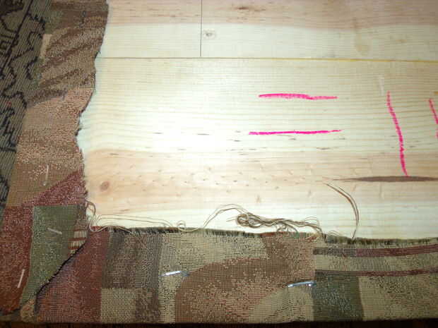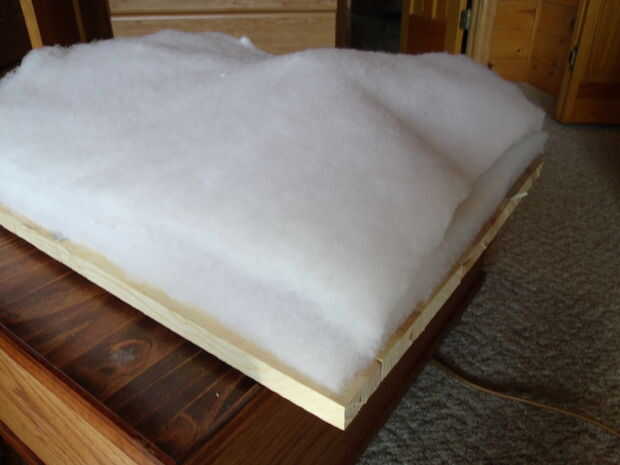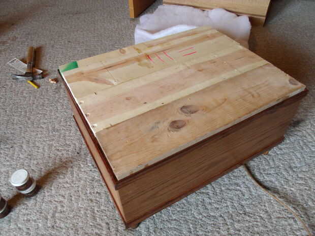 El colchón superior de mi otomano fue hecho de modo que se puede quitar. De esta manera, el otomano puede convertirse en una mesa final si quiero. Tuve que hacer un Consejo para esto, así que pegué 3 - 3/4 "x 6" tableros juntos. Cuando que era seco, cortar todo hasta las mismas dimensiones como el tablero superior... Esto hará que el tapón que se atribuyo el acolchado y la tela a. Cuando todos los 'límites' se cortan, el pad es la última cosa que hacer. Sólo ponga la almohada de relleno en la tapa, había estirado mi material sobre él y grapados en la parte inferior. Simple como eso.