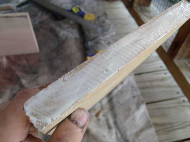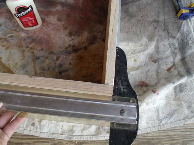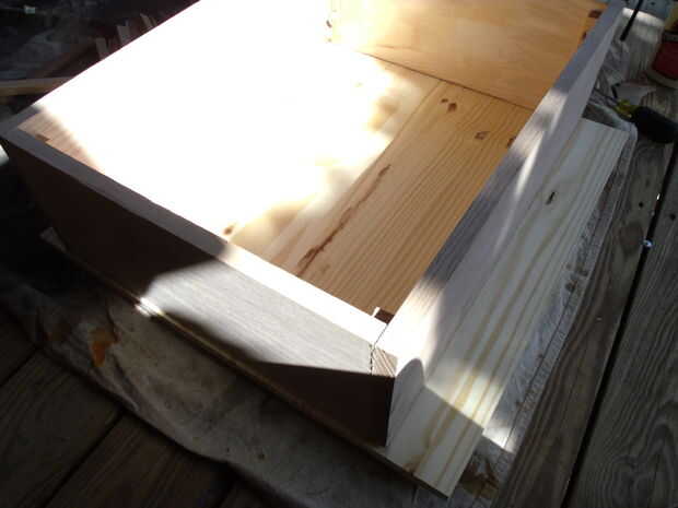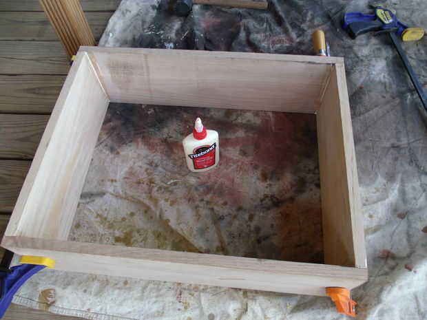 Elegido algunos roble que donaría mi mecedora, siete pies lineales de roble 3/4 "x 8". Se trata de las paredes laterales de la caja. Cortar cuatro tablas, 2 - 24" y 2 - 18" longitudes, comencé por pegar en un rectángulo, usando una escuadra para asegurarse de que las esquinas eran cuadradas. Una buena capa de pegamento es necesaria en cada junta para velar por que la caja hermética beas como sea posible. Recuerde que es importante fijar piezas de madera juntos cuando se unen con pegamento. Obliga a la cola en los poros de ambas piezas de madera. Cuando el pegamento se seca, refuerza las esquinas con las tiras de 6" de 1" x 1" que pegados y atornillados en su lugar.