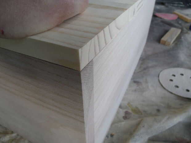 La razón manchada la madera antes que todo, montado es porque usé dos colores diferentes. Si el cuadro fue montado completamente, sería casi imposible mantener la mancha roble de sangrado en el pino, o viceversa. Si construir esto y usar un solo color, puede esperar hasta que la caja está completamente montada para lo de la mancha.