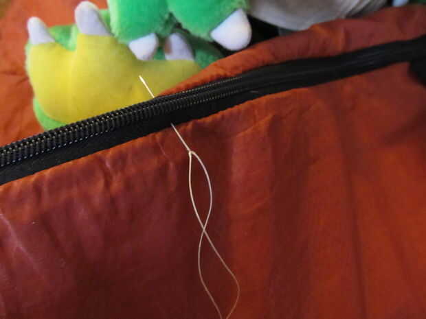 Pellizcar las cremalleras de tu saco de dormir dos juntos en la parte inferior, y luego ejecute su aguja lanzó dos cremalleras justo debajo de la cremallera en la parte de tela de la cremallera.