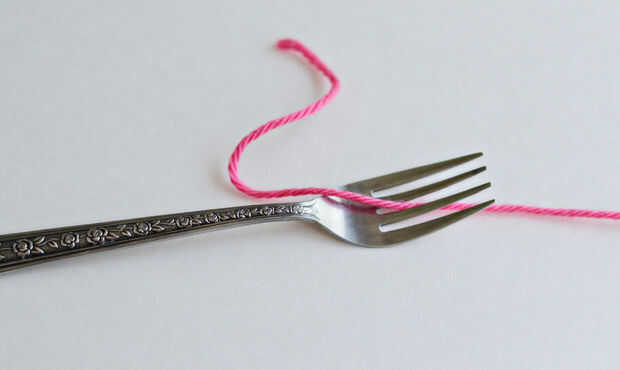 he cambiado las direcciones un poco, encontré que enhebrar el hilo para atar el pom fue más fácil de colocar sobre el tenedor primero en lugar de último.  Por lo tanto, encontrar una bifurcación, clip un poco de hilo y colócala en la media punta.