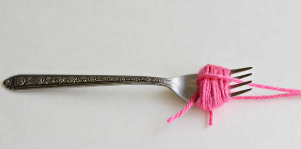 Envuelva el hilo alrededor de la horquilla, a continuación, tire hacia arriba el hilo de atar.