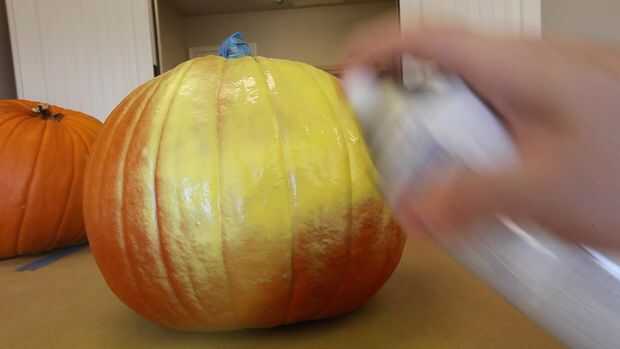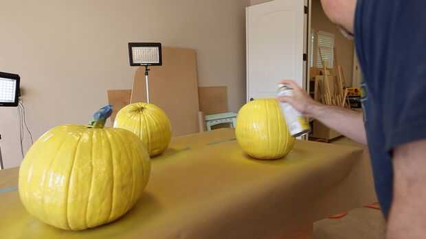 Calabazas son de color naranja, pero necesita su ser amarillo. En mi caso, opté por grafitear mi calabaza entera con una pintura de aerosol de laca base desde el centro del hogar. Pero usted puede fácilmente usar acrílico hobby y manualidades. Si vas al método de pintura en aerosol, asegúrese de esperar 24 horas antes de pasar al siguiente paso.