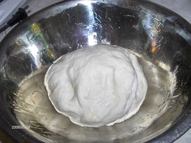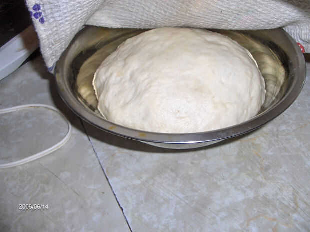 Disolver la levadura en agua tibia, ponerlo a un lado por unos minutos hasta bubbly. Luego agregar el huevo batido, trozos de mantequilla y azúcar. Espolvorear la sal sobre la parte superior y agregar la harina taza por taza hasta incorporado. Conjunto a un lado, ligeramente cubierto en el mostrador durante un par de horas hasta resucitado. Use inmediatamente.