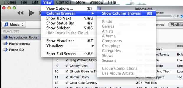 Comando-B en el teclado. Esto hará que el navegador de columnas visibles. En la sección de música, navegador de columna sólo puede demostrarse en las vistas de listas de reproducción o canciones.