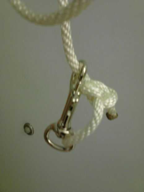 En el extremo libre de la cuerda un nudo as de guía por el extremo cerrado de la abrazadera del eslabón giratorio. Y clip el clip giratorio en la cuerda unas pocas pulgadas del nudo.