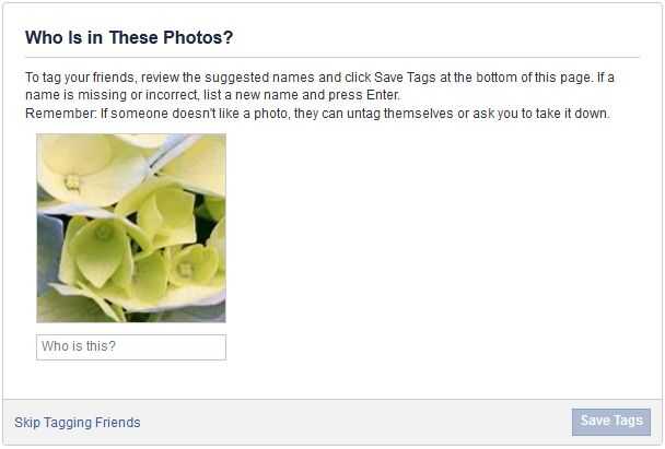 a continuación, Facebook probablemente le preguntará para etiquetar tus amigos o consultar que sus etiquetas sugeridas son correctos antes de pasar. Para continuar, revise/Agregue las etiquetas y pulse