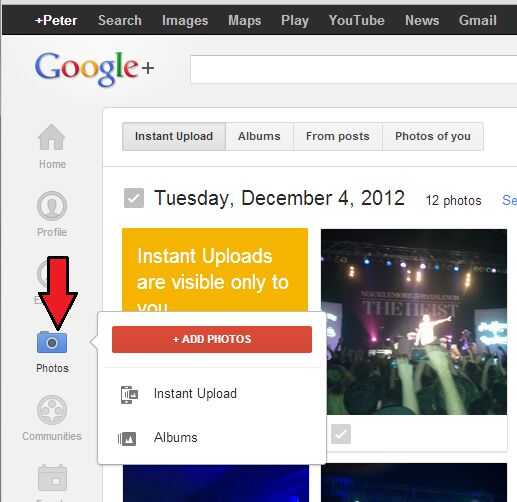 De tu página de Google +, pase del el icono de la foto, pero No haga clic en él. Aparecerá un pequeño cuadro con varias opciones. Haga clic en "Agregar fotos"