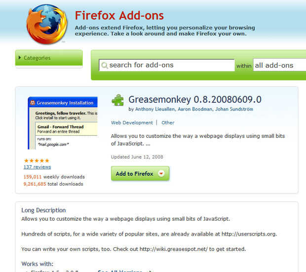 Página de complementos para Firefox y Greasemonkey Instalar