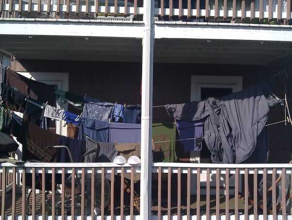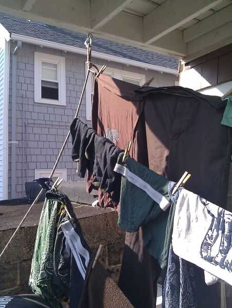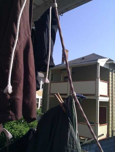 Aquí es una percha cuerda en escalada, hizo atar cuerda vertical dos ángulos ligeramente a ambos lados del pórtico, y luego ejecutando tendedero entre ellos. Hace para 3 niveles de tendedero de estilo estadio. Y los nudos se pueden empujar, cuando se hace la sequedad, o derribado (es un nudo corredizo que tiene tensión cuando hay peso en la línea de.