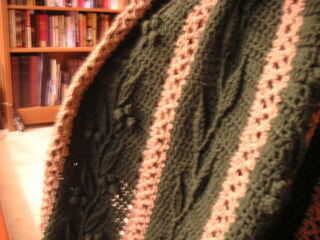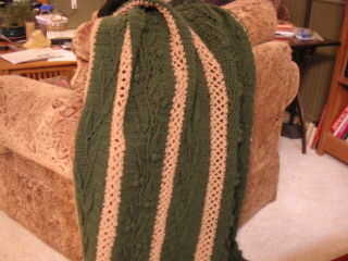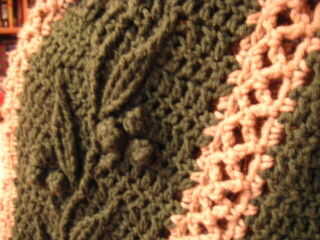 hice este afgano, mi primer gran proyecto, usando un patrón de los afganos de ocio artes libro jardín de flores, por Rena V. Stevens. Utilicé hilos de León marca lana fácil. Me encantaron los patrones porque son tan diferentes, como se puede ver las flores y enredaderas son superponer la capa de base, pero realmente son de ganchillo al mismo tiempo, no viró más adelante. Esta foto muestra un cierre para arriba de un panel de "baya" que también cuenta con vides y hojas.