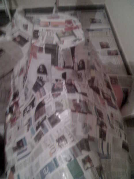 Ahora corta el periódico en partes más pequeñas, y ápice un pincel extender cola blanca sobre el cartón.