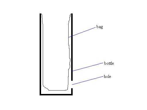 empezar por cortar la parte superior de una botella grande. cortan un pedazo grande de plástico plana (sin bordes) de la bolsa de plástico para que tenga una hoja de plástico flexible. doblar por la mitad y pegar para hacer una bolsa que apenas puede sostener el frasco grande de topless. Coloque la bolsa dentro de la botella por la parte superior y pegar el borde de la botella hasta el borde de la bolsa. Luego corte un pequeño agujero para el aire pase a través y inflar el tanque de lastre para hacer flotar a la superficie cuando esté en uso.