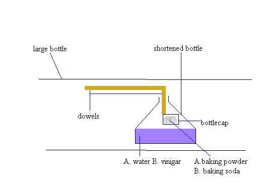 el inflater infla el lastre por aumento de presión interna para disminuir la densidad. en primer lugar, cortar la parte superior e inferior de una de las botellas pequeñas. cinta o caliente encolarlos y asegúrese de que la costura es resistente al agua. caliente pegar chapas en el extremo de una espiga corta y pegar el otro extremo de la espiga a una espiga más larga a 90 grados. Llene la botella de A.water B.vinigar y las chapas se llenan de polvo de hornear a. B. bicarbonato de sodio.