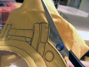 Ahora necesitamos cortar cerca de nuestras puntadas alrededor del exterior de nuestro ojo de buey y se acabó por ahora. Podemos poner a un lado y seguir con el resto de la pieza.