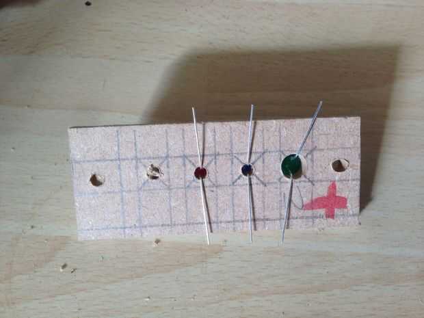 Tenga cuidado de mantener la polaridad (la pierna más larga del LED es positiva), se utilizó un plus rojo para significar el lado positivo. Hemos doblado las patas LED para mantener los LEDs en los agujeros antes de que nos podríamos pegar.