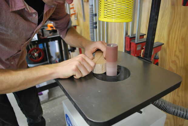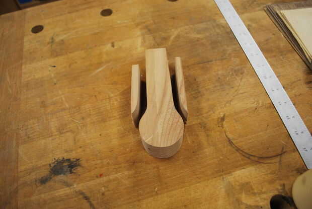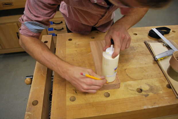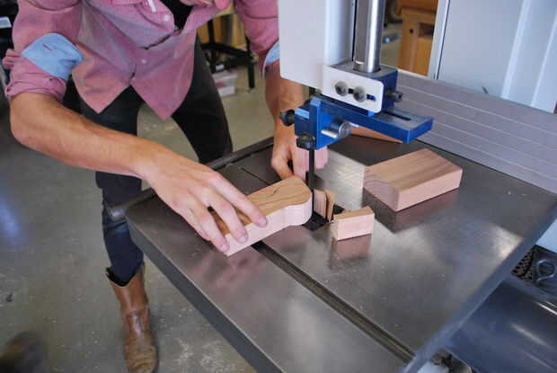 Trazado una botella de pegamento para marcar mis curvas. A continuación cortar una forma de Piruleta de la pieza de 2 x 4 para crear la forma básica del molde. Para este molde es importante mantener el corte de piezas ya que se utilizarán como piezas del molde así. Utilice una lijadora para alisar hacia fuera los pedazos del molde para asegurar una superficie lisa en el interior del gancho.