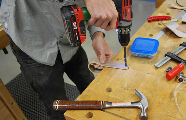 Cerca del extremo del gancho perfore un agujero de 3/8 de pulgada. Se puede utilizar una prensa del taladro, pero acababa de usar un taladro de mano simple. Es bueno tener un bloque de apoyo al perforar la madera para que no dañar la mesa y para evitar rasgaduras en la pieza que son de perforación. Hay grandes agujeros en el Banco de trabajo que se estaba usando, sirven para la sujeción, así que fui de perforación sobre uno de ellos en esta foto. En retrospectiva, un bloque de apoyo habría sido una idea mucho mejor.