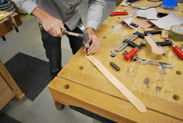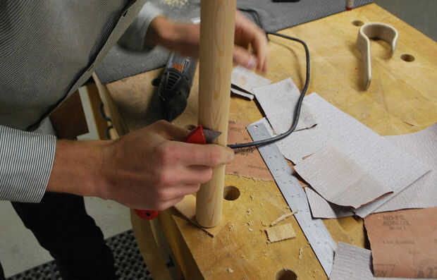 Cortar el cuero en un rectángulo que es cerca de 12 pulgadas de largo por 1.5 pulgadas de ancho. Utilicé una clavija de 1,5 pulgadas para marcar una bonita curva en los extremos de mi correa de cuero, pero podría hacerlo a ojo o localizar cualquier otro objeto de diámetro de una pulgada. Utilice un perforador de cuero para cortar un agujero en cada extremo de la piel.