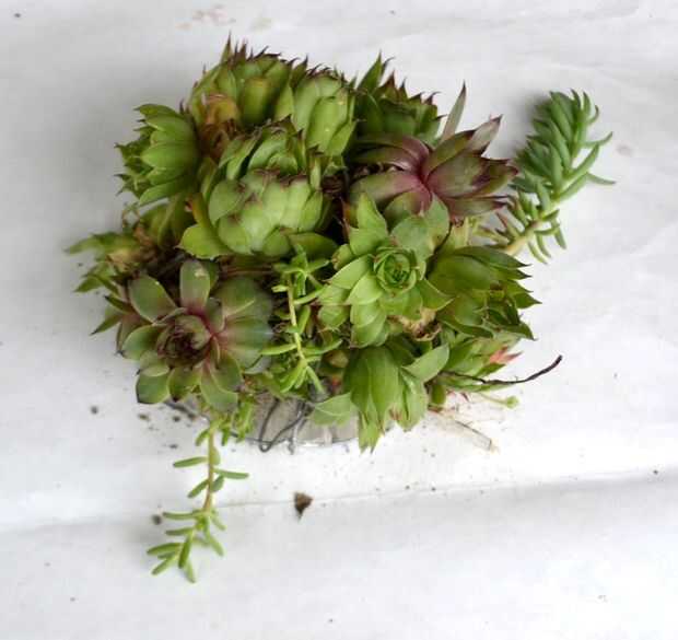 Cubrir cada media esfera con suculentas, inserción de las raíces entre los agujeros.