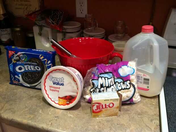 Para hacer la caída de nieve, se necesita: 1 caja de budín instantáneo chocolate blanco 1 8 onzas taza de cool whip 24 galletas Oreo (aplastado) 2 tazas de malvaviscos mini 2 tazas de leche 1 bol para mezclar 1 bate bolsa de ziplock tamaño 1 congelador