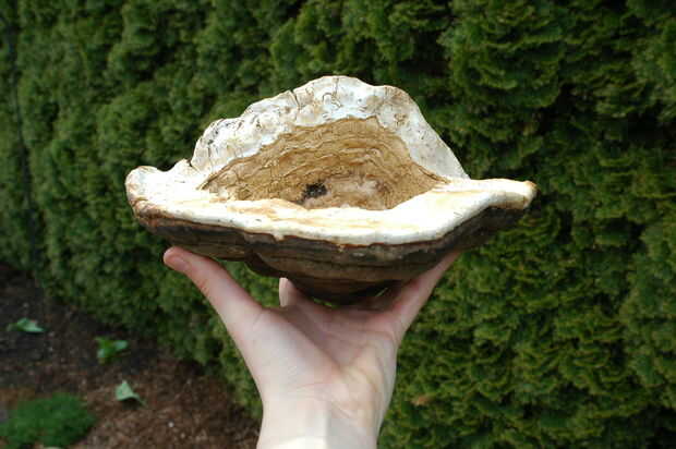 El punto más oscuro que ves al otro lado de la caverna que cavó hacia fuera es el lado donde el hongo fue atado al árbol. Es similar a la corteza y muy denso. Es el lado a través del cual adjuntará a la guía con tornillos.