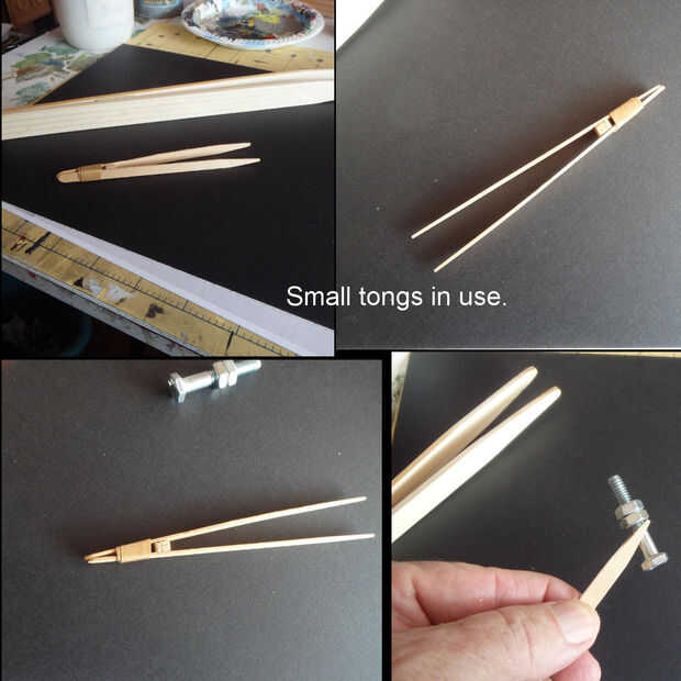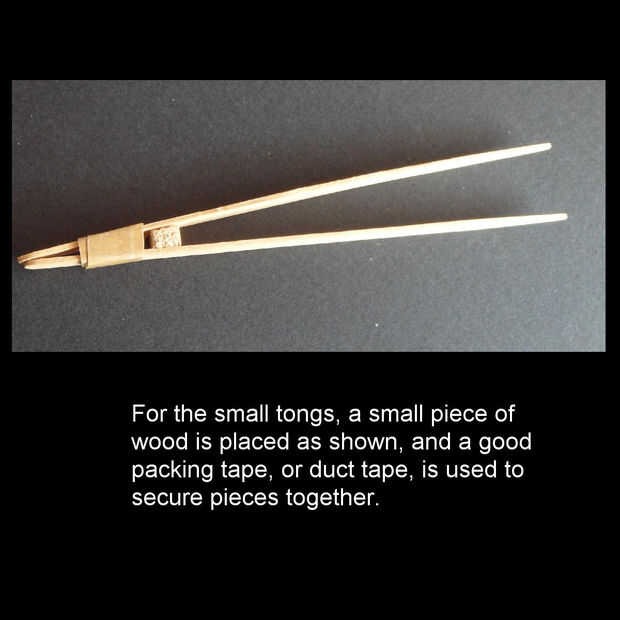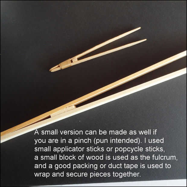 Aquí se hizo una versión más pequeña de pinzas o fórceps. Cuando usted no puede encontrar sus pinzas o fórceps, golpear juntos unos palos de madera y poner fin a la frustración!  Bueno para el uso si no metálico pinzas, como en eléctricos funcionan, tal vez, es necesarios.