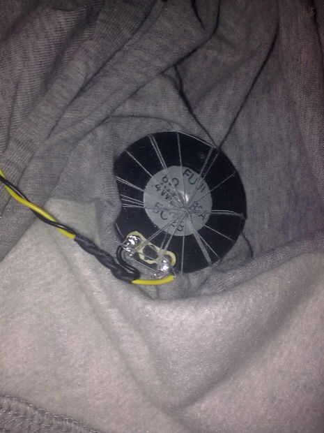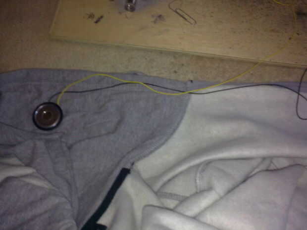 Luego de la soldadura de los cables, tiempo suficiente para salir de una de las capillas baje las esquinas, a los altavoces y coloque los altavoces dentro de la campana usando alfileres de costura. Una vez que se aseguran probar el hoodie y asegúrese de que está contento con su posición. Si no cambiar hasta que estés. Luego coserlas de manera que permanezca en su lugar, lo hice haciendo una especie de telaraña de patrón alrededor de la parte posterior de la misma sólo por tomar constantemente el hilo de un lado del altavoz a los otros y poco a poco va redondo en un círculo.