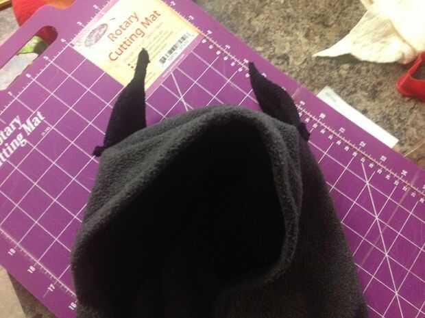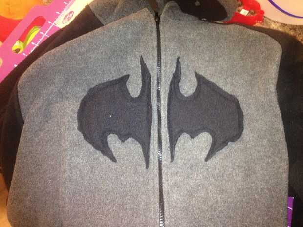 Arme su hoodie en cualquier orden. Comencé por la máscara de costura en la campana. Una vez que completa, os adjunto las orejas para el exterior teniendo en cuenta deben ser superiores en la cabeza así que están parados para arriba. A continuación fueron las puntas del brazo. Éstos se unen en la costura. (usted podría también separar la costura de la manga y coser en). He decidido dejarlos fuera desde el color de la manga y las puntas conciliadas. el cabo debe ser cosido en los hombros o en menos de dos puntos. Último era el logo del murciélago. He dejado un poco de espacio para no interferir con la cremallera. Siempre se pueden coser más cerca, o usted podría optar por una impresión de la transferencia del calor. Ahora es completa y funcional.