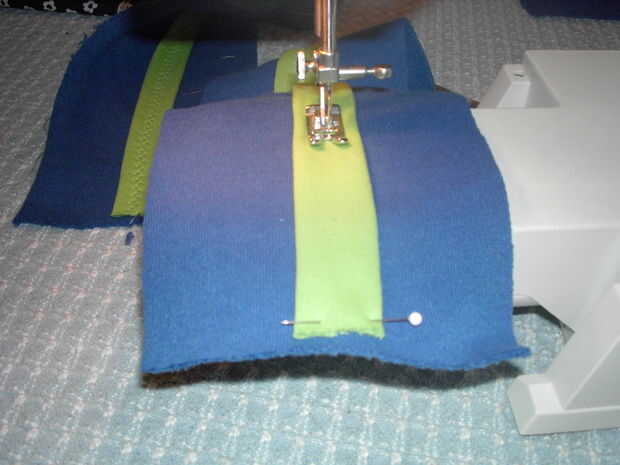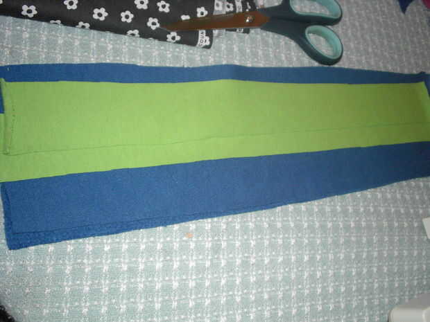 Abrir la otra manga y dividir por el medio de dos correas. Utilice una regla para marcar una franja uniforme y recorte al tejido extra para tener un rectángulo. He añadido una tira de tela de desecho para el color, hilvanar en antes de hacer las asas. Esta camiseta fue muy pesado por lo que en lugar de coser las manijas de adentro hacia fuera y girando, yo topstitched el crudo termina abajo del lado derecho. Usted puede escoger la mejor manera para su diseño. Prender las manijas puntos distantes igual y cose a la costura en la muesca. Este es un punto fuerte y el costillaje luego actúa como una aleta de la cubierta en la parte superior de la bolsa.