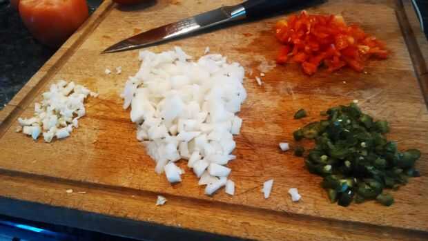 Primero empezar por cocinar la quinua. Siga las instrucciones en la bolsa o caja. Mientras la quinua cocina dados hasta ajo, jalapeños, cebolla, cilantro y pimiento rojo.