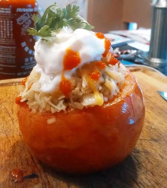 Retirar los tomates del horno y dejarlos reposar 5 minutos antes de añadir los ingredientes. Coloque una cucharada de crema agria, una pizca de sriracha y una pizca de cilantro por encima. ¡ Servir!