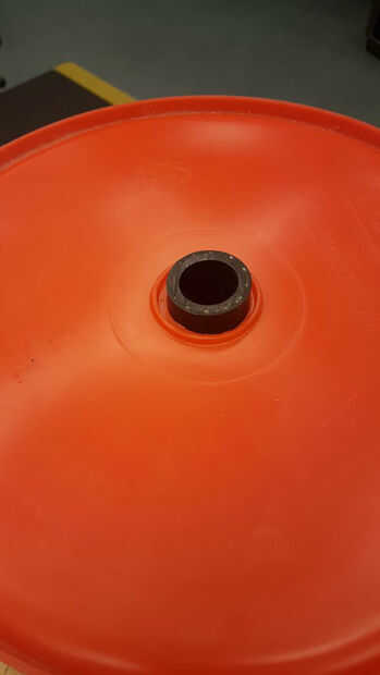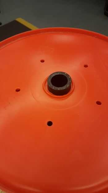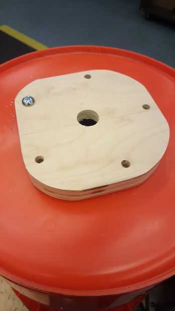 A continuación, alinee el espaciador con el agujero en la parte inferior de la canastilla, insertando el tubo interior en el agujero de centro en el cubo (imagen 1) y colocando al espaciador piñón escariados en la parte superior del cubo, tal que el tubo interior se basa en la parte inferior de la cavidad escariada. Puesto que el tubo interior es mayor que el cubo, es necesario apoyar el cubo sobre una superficie plana con la separación en el centro por la cantidad extra de tubo interior que se extiende más allá de la parte inferior de la cubeta (imagen 2). Perforar el primer agujero de fijación del piñón en el cubo (imagen 3). Inserte un tornillo a través del espaciador de la rueda dentada y cubo para mantener alineamiento (imagen 4). Taladre los orificios restantes, introduciendo un tornillo para mantener la alineación después de terminar cada hoyo. Ahora alineen los agujeros! (imagen 5)