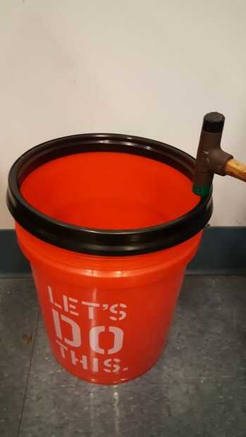 (Yo realmente volcó el balde y se arrodilló sobre él para empezar a presionar la tapa, trabajado a mano, luego finalmente lo martilló todo el borde con el mazo.)