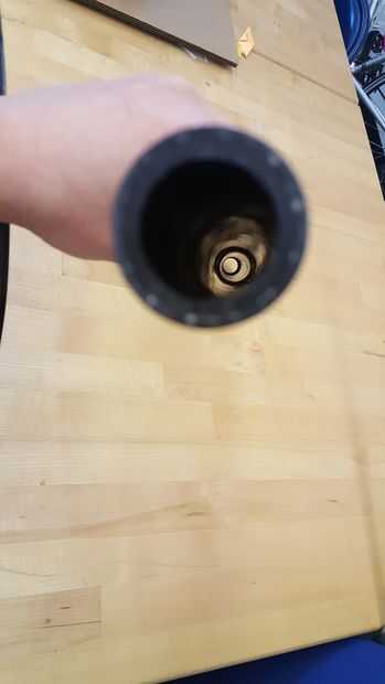 Prense el cojinete no ensanchado en el tubo interior alrededor de donde debe ser el final de la tapa de la cubeta. El eje interno funciona bien para aprovechar el cojinete en su sitio.