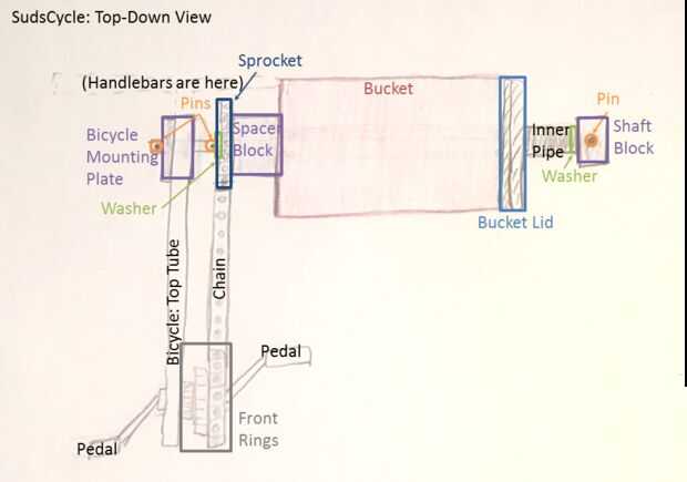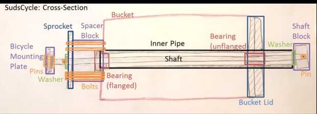 Para minimizar la huella y activar un cambio relativamente rápido entre la configuración de la máquina de lavar y una bicicleta de paseo-listo del viajero, este diseño conduce de una cadena adicional que se desliza sobre el anillo más grande delantero de la bicicleta. Esta segunda cadena impulsa una rueda dentada que se une al cubo (recipiente de lavado) con cinco pernos que corren a través de un bloque espaciador. El cubo es apoyado por un tubo interior, por donde discurre un eje. Dos rodamientos de ajuste entre el tubo interior (que gira con el cubo) y el eje (que es fijo). En un extremo, el eje se fija con un perno en el bloque del eje (que, durante la operación, se apoya sobre un pedazo de muebles proporcionados por el usuario). En el otro extremo, el eje está limitado con una madera placa de fijación de la bicicleta, que se fija con correas a la bicicleta Top tubo y el tubo de abajo. A ambos lados de la placa de fijación de la bicicleta, el eje axial está limitado por dos pernos; otro Pin justo delante de la rueda dentada axialmente restringe el cubo.