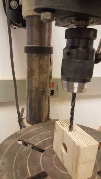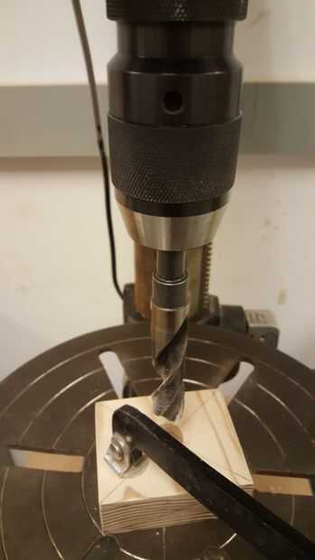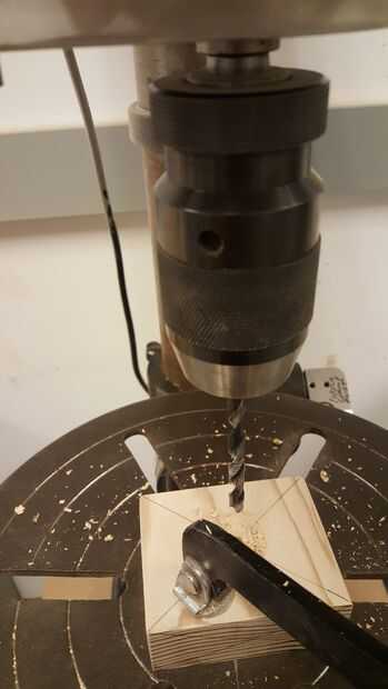 La otra marca es para el perno, que limita el eje de movimiento axial. Buscar una broca que coincida con su diámetro (yo usé un tornillo de 1/4-20, para perforar una 17/64") y perfore otro orificio aquí.