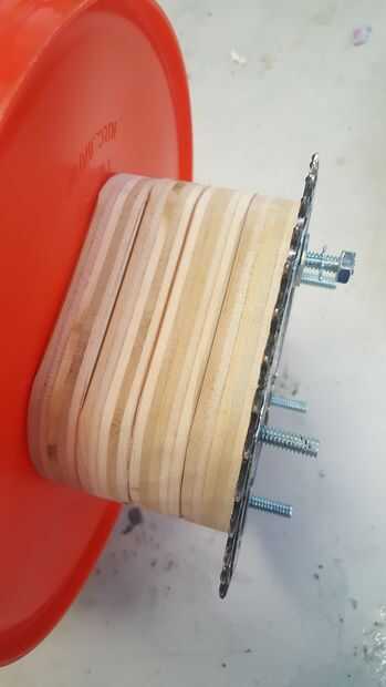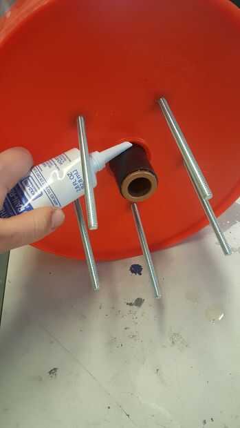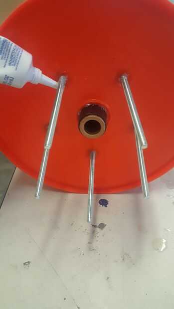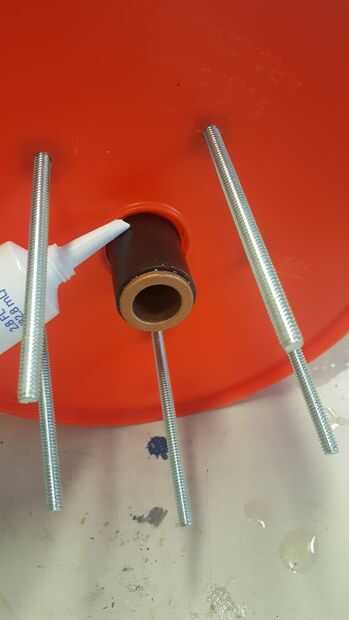 Es más fácil montar esto de poner la arandela y arandela plana en cada uno de los pernos, pegándolas por el cubo y añadiendo un poco de masilla en cada uno. Mientras estás en ella, poner un anillo de masilla alrededor de donde el tubo interior se encuentra con el cubo. (Tenga cuidado de no conseguir masilla en los cojinetes aquí!) Luego deslice el bloque espaciador y el piñón en y por último añadir las arandelas y tuercas en el otro extremo de la Asamblea.