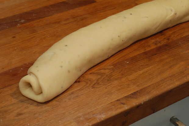 4. ahora corta el rectángulo por la mitad longitudinalmente y enrollar cada rectángulo más pequeño en forma de registro apretado con el relleno en el interior.