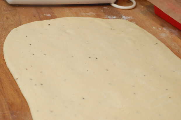 2. tomar la mitad de la masa y colocar sobre una superficie ligeramente enharinada. Utilice un rodillo para estirar la masa formando un rectángulo de 0,5 cm de espesor.