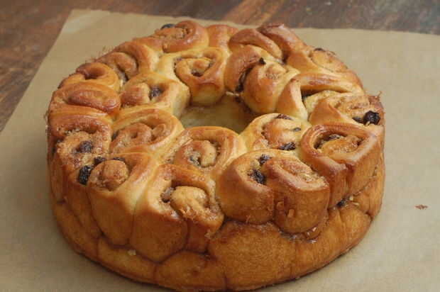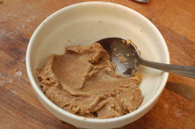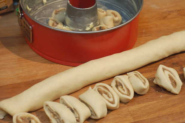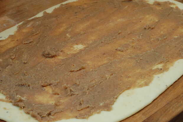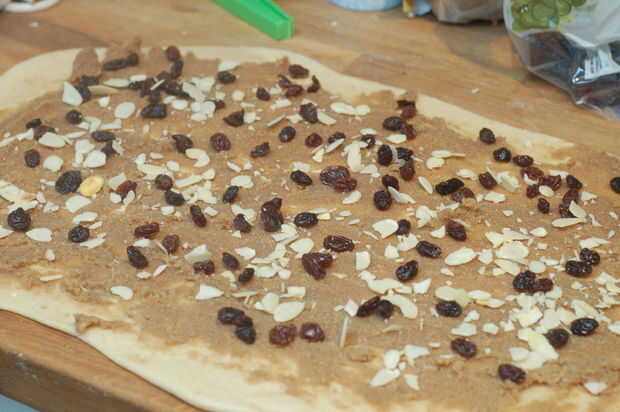 3. mezclar junto la mantequilla, azúcar y especias y difusión sobre la masa, espolvorear encima las pasas y las tuercas si usa. Asegúrese de que hay una cubierta uniforme.