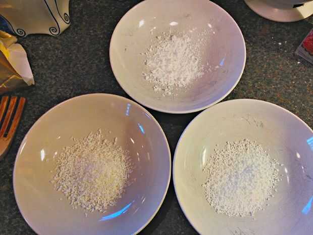 Llenar 3 tazones de azúcar perla, copos de coco y azúcar en polvo.