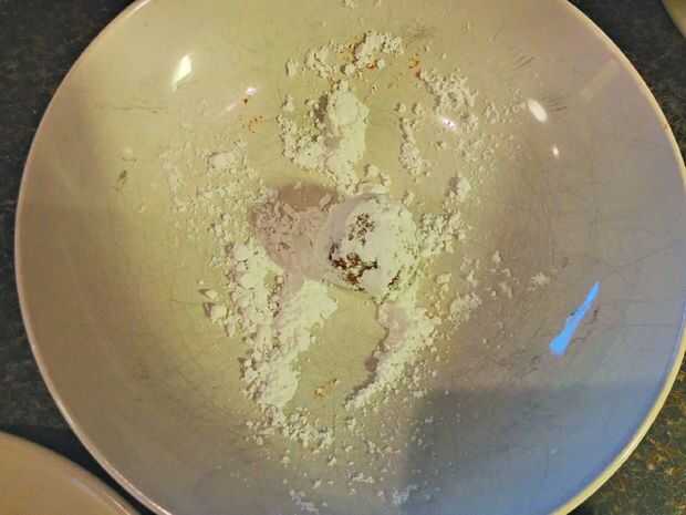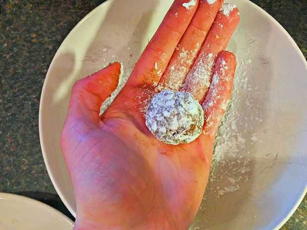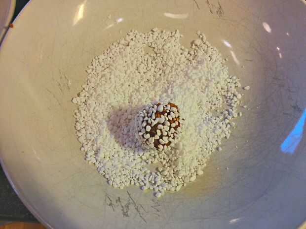Cuando ruede en azúcar en polvo, asegúrese de agitar el chocolate mordida en la mano como se pone mucha azúcar en polvo sobre ella. Visto en el cuadro 3 y 4.