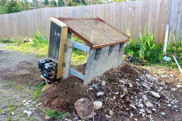 Tuve suerte de encontrar una vieja mesa de trabajo de acero galvanizado en un depósito de metal de chatarra que vuelca para formar la U en forma de chasis necesarios para conseguir el cubo de tractor en sacar con pala encima de suelo tamizado. Yo pagué sólo $100 para la tabla que es probablemente menor que el costo para hacer uno desde cero. Las dimensiones de la mesa no ideal (ver video abajo) pero funcionaba bien después cavé la tierra para obtener suficiente inclinación de pantalla (30 grados a la horizontal). Cargar al formulario desde el lado "equivocado" como el lado "derecho" es demasiado alto. Esto trabaja todo bien y obtener una gran vista de la acción de investigación desde el lado de carga.