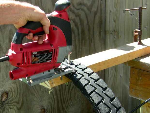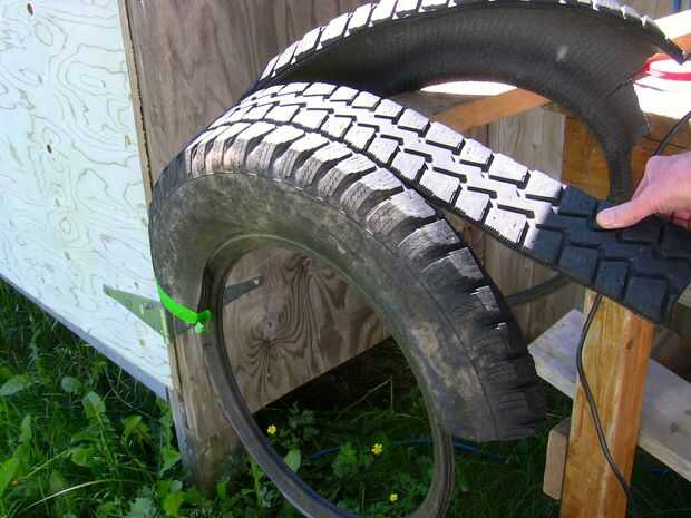 Traté de usar resortes de secciones radiales del neumático (igual que las bisagras en el paso 3) sino que forma era un poco demasiado flexible. Los resortes que se muestra fueron cortados de la circunferencia de centro del neumático. Cada primavera es aproximadamente de 16 pulgadas de largo antes de ser formado en la forma requerida de la U.
