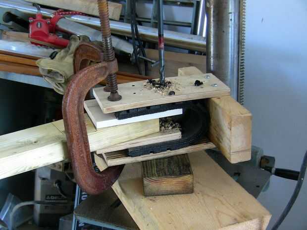 Sujeta la presión tratada de 2 x 4 de la pierna, junto con el resorte neumático, en la plantilla y perforado los agujeros completamente con que todo trabaja con un pedacito de taladro de torcedura extra larga de 3/8 de pulgada.
